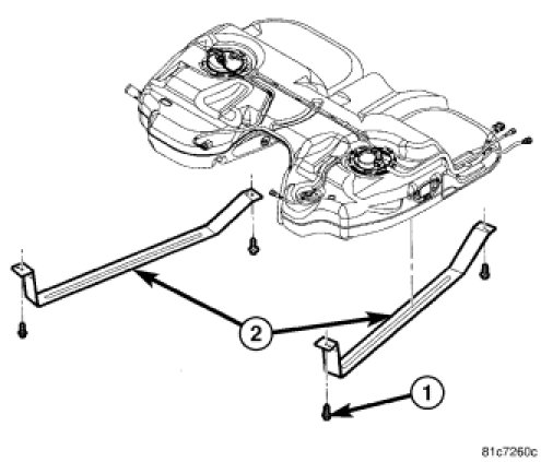 4. Install straps (2) and fuel tank strap bolts (1), tighten bolts to 54 Nm (40 ft. lbs.).