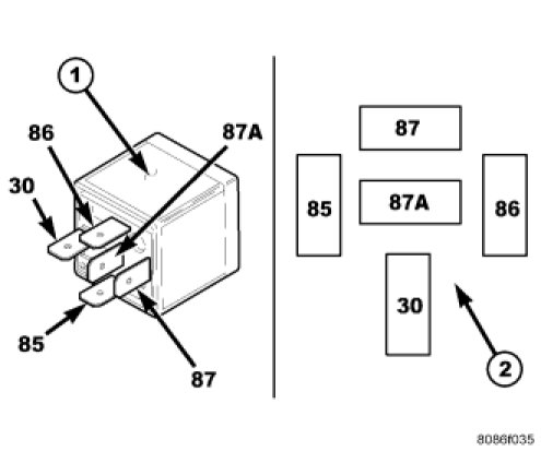 3. Connect a battery B+ lead to terminals 85 and a ground lead to terminal 86 to energize the relay. The relay should click. Also test for continuity between terminals 30 and 87, and no continuity between terminals 87A and 30. If OK, refer to Relay Circuit Test procedure. If not OK, replace the faulty relay.