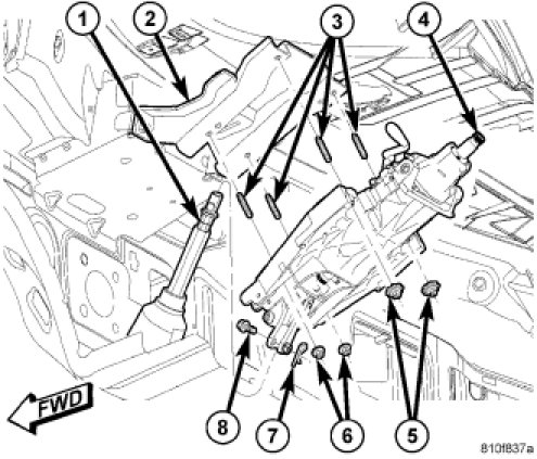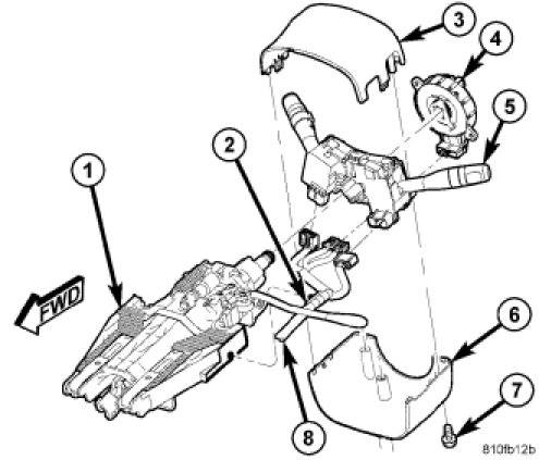 13. Remove column wiring harness (8) routing clip (2) from left side of column.