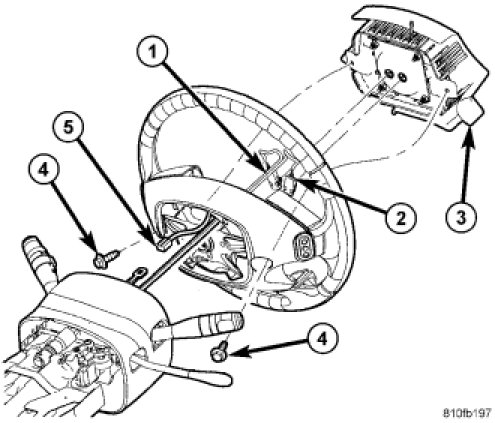 4. Lift airbag (3) from mount and disconnect two airbag squib connectors (1, 2) and horn connector (5). Remove driver airbag.