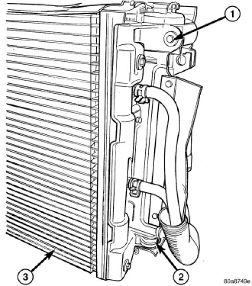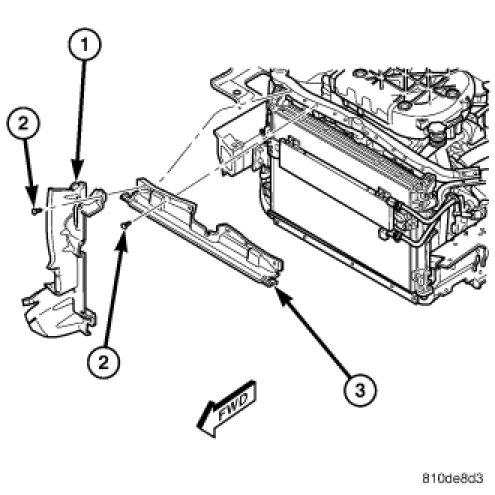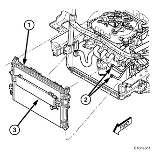 10. Remove the A/C condenser side brackets to radiator attaching screws. Separate the condenser from the radiator by lifting upward to disengage from lower mounts. Allow the condenser to rest in front of radiator.