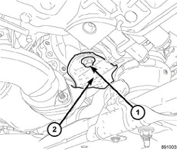 2. Remove bolt (1) from lower part of PTU heat shield (2).