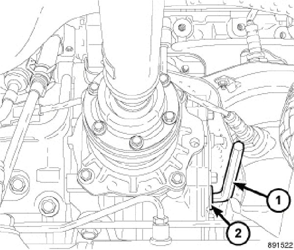 6. An allen wrench (1) with approximately 1-1/8" clearance in the location shown (2), will be required to remove the PTU fill plug.