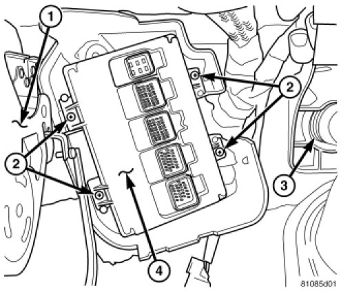 7. Remove the four screws (2) holding the BCM to the bulkhead.