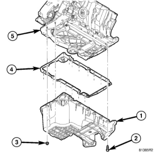 OIL PAN TORQUE AND SEQUENCE1. First tighten the M8 oil pan alignment bolt (2) to 28 Nm (250 lbs. in.), then tighten alignment pan bolt (3) to 28 Nm (250 lbs. in.).