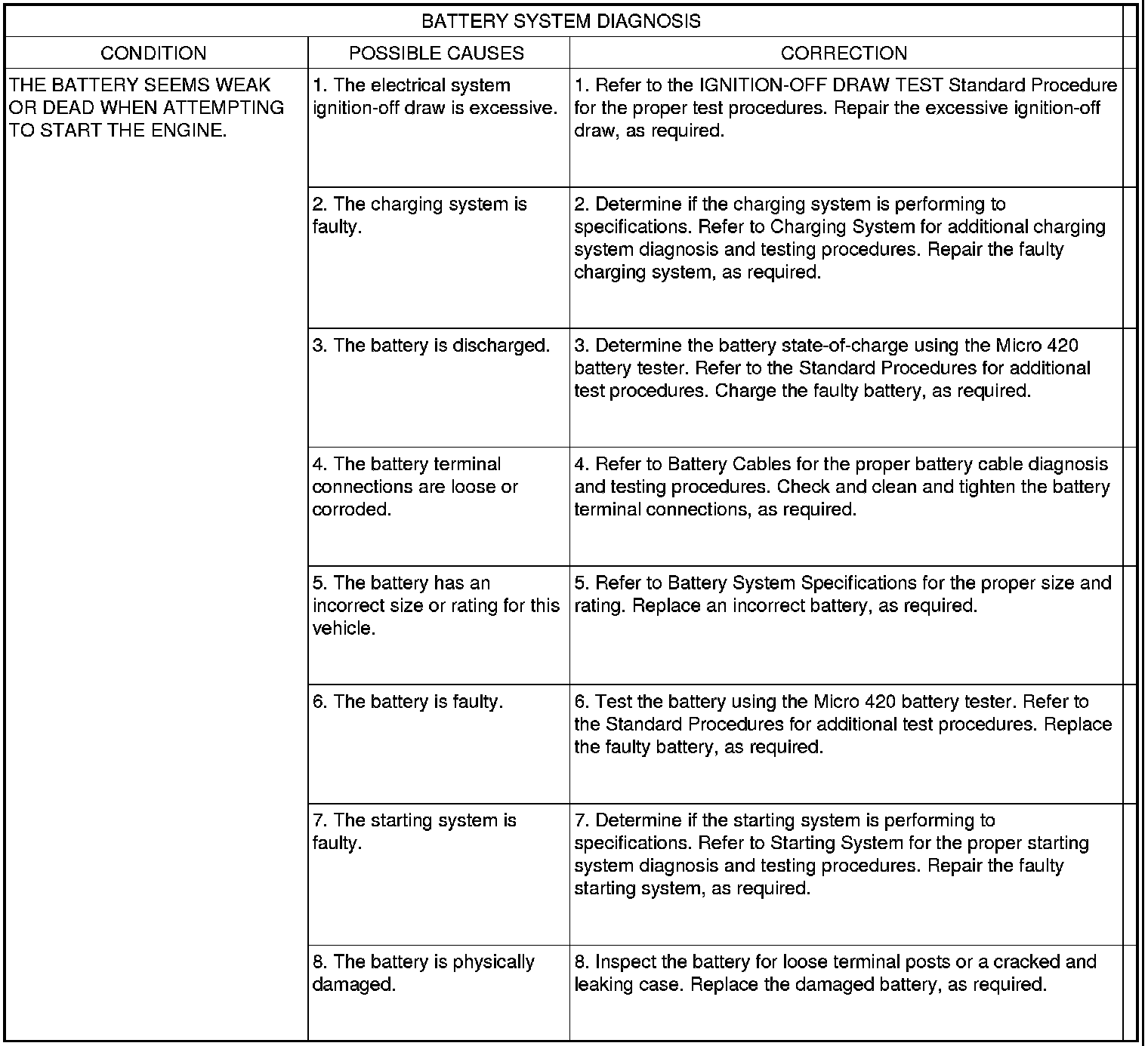 The battery, starting, and charging systems in the vehicle operate with one another and must be tested as a complete system. In order for the engine to start and the battery to maintain its charge properly, all of the components that are used in these systems must perform within specifications. It is important that the battery, starting, and charging systems be thoroughly tested and inspected any time a battery needs to be charged or replaced. The cause of abnormal battery discharge, overcharging or early battery failure must be diagnosed and corrected before a battery is replaced and before a vehicle is returned to service. The service information for these systems has been separated within this service manual to make it easier to locate the specific information you are seeking. However, when attempting to diagnose any of these systems, it is important that you keep their interdependency in mind.