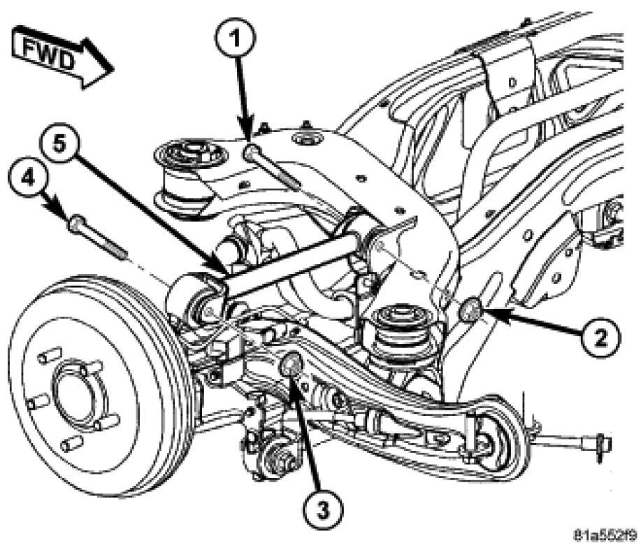 6. Make a reference mark on the toe link cam (3), remove the toe link cam bolt and nut (1) attaching the toe link (2) to the rear suspension cross-member.
