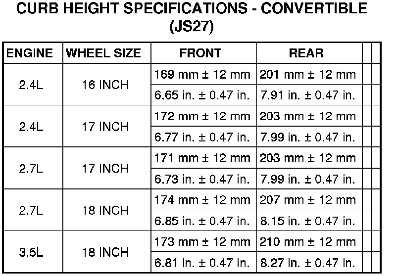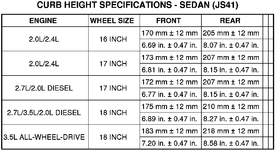 Vehicle height is to be checked with the vehicle on a flat, level surface, preferably a vehicle alignment rack. The tires are to be inflated to the recommended pressure. All tires are to be the same size as standard equipment. Vehicle height is checked with the fuel tank full of fuel, and no passenger or luggage compartment load.
