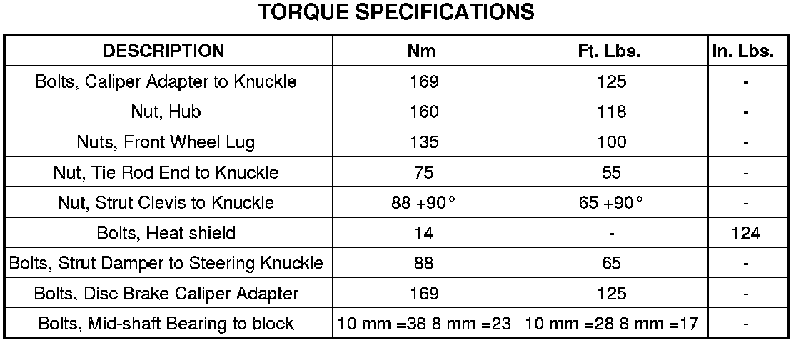 SPECIFICATIONS - HALF SHAFT - FRONT