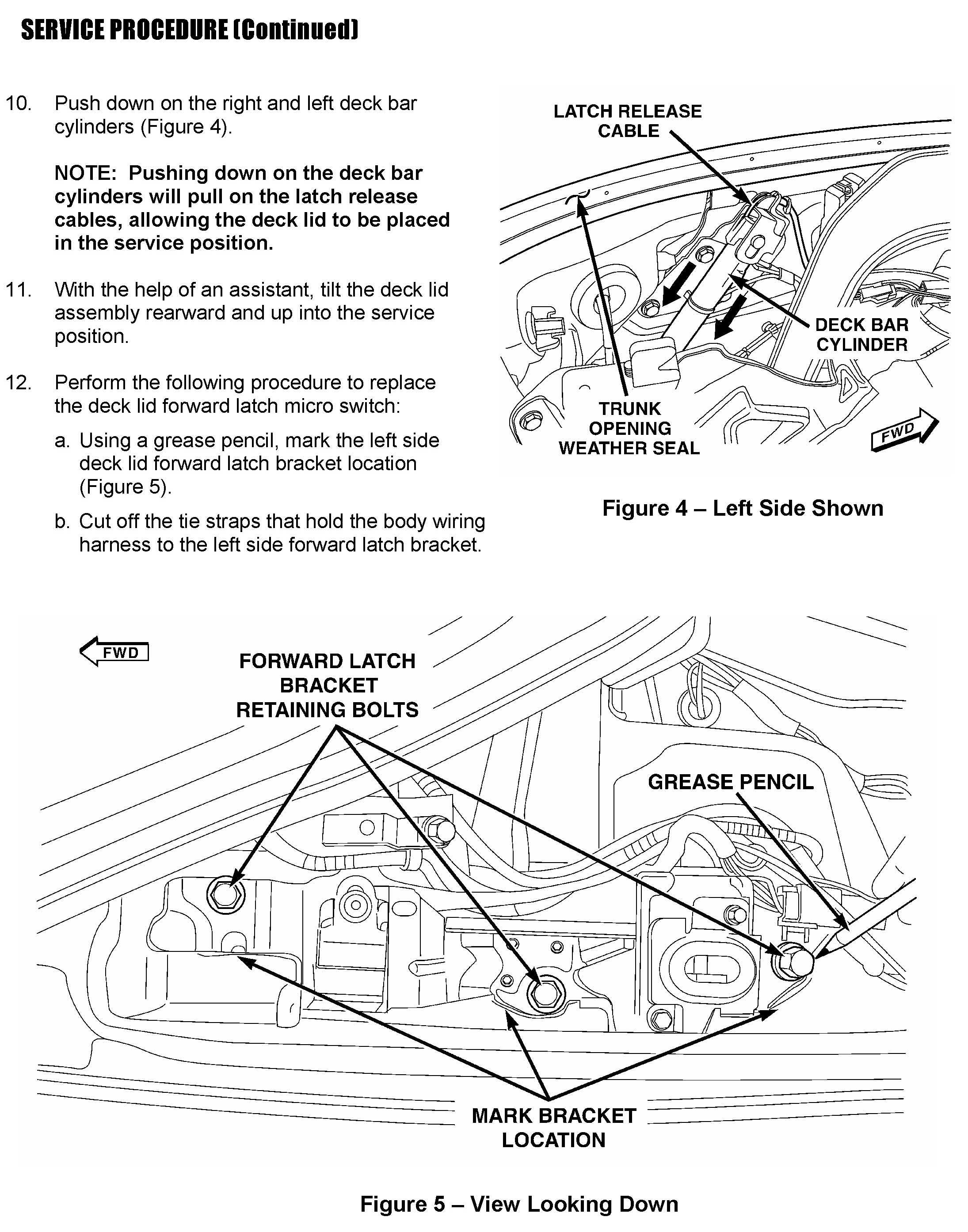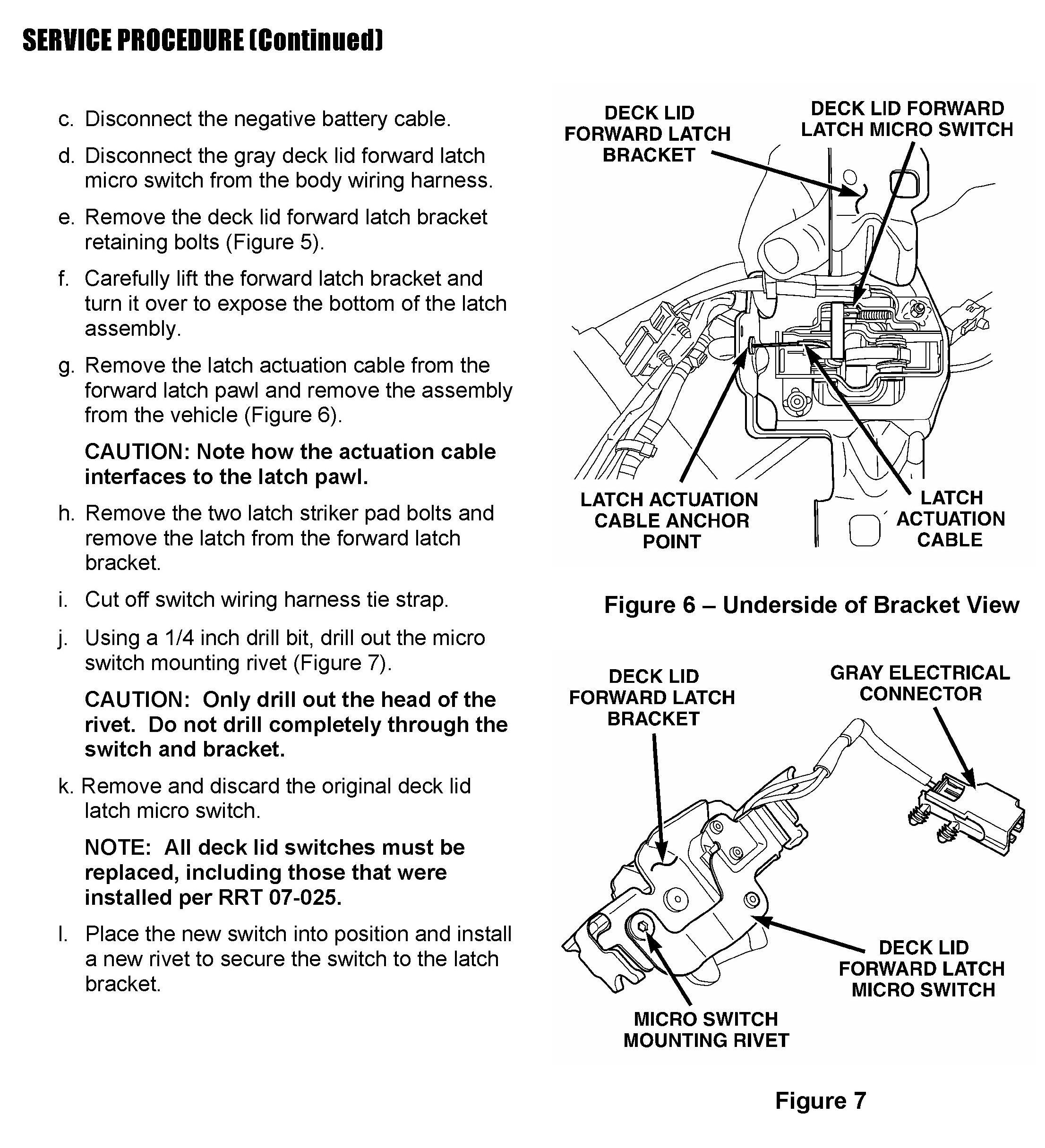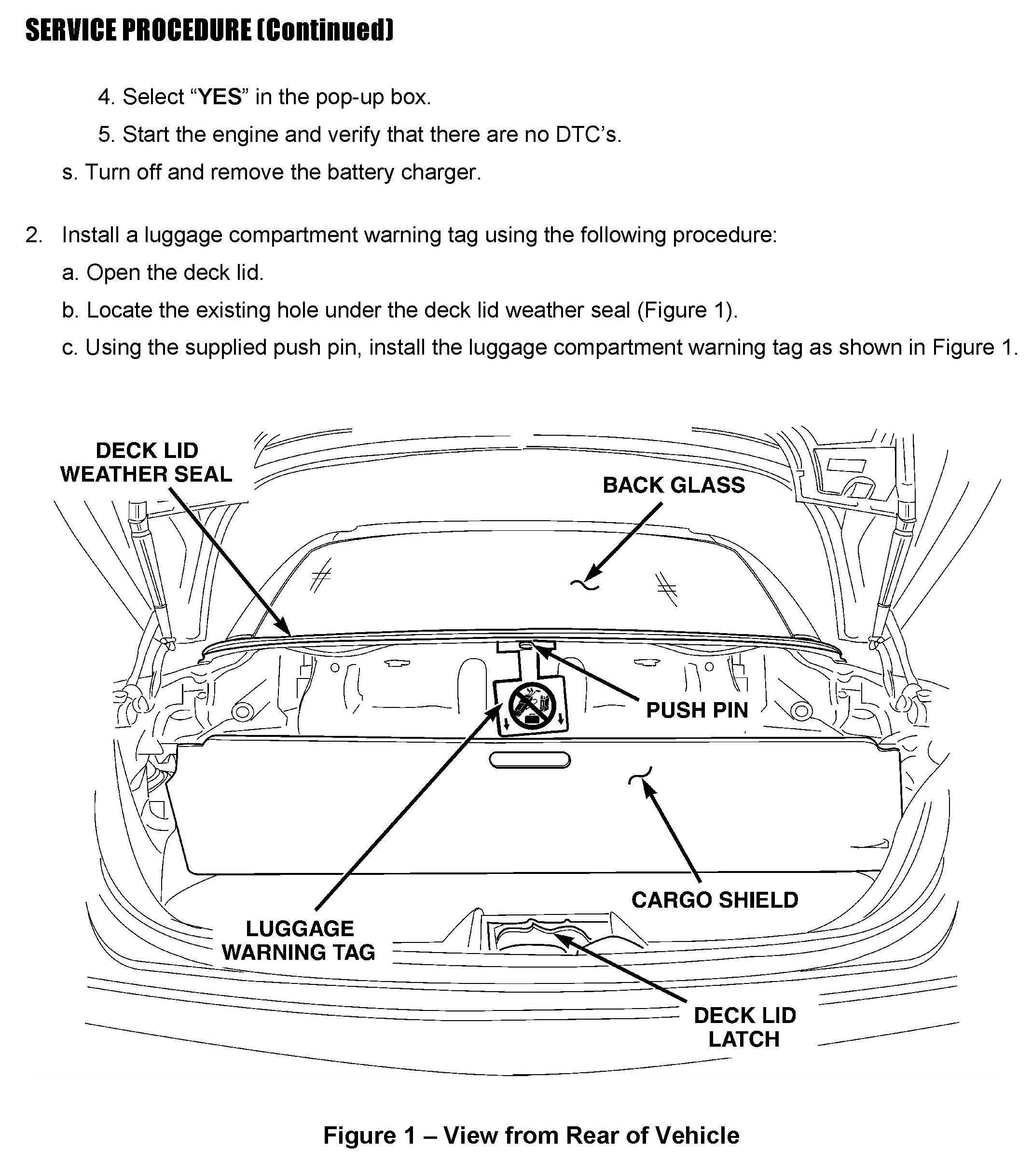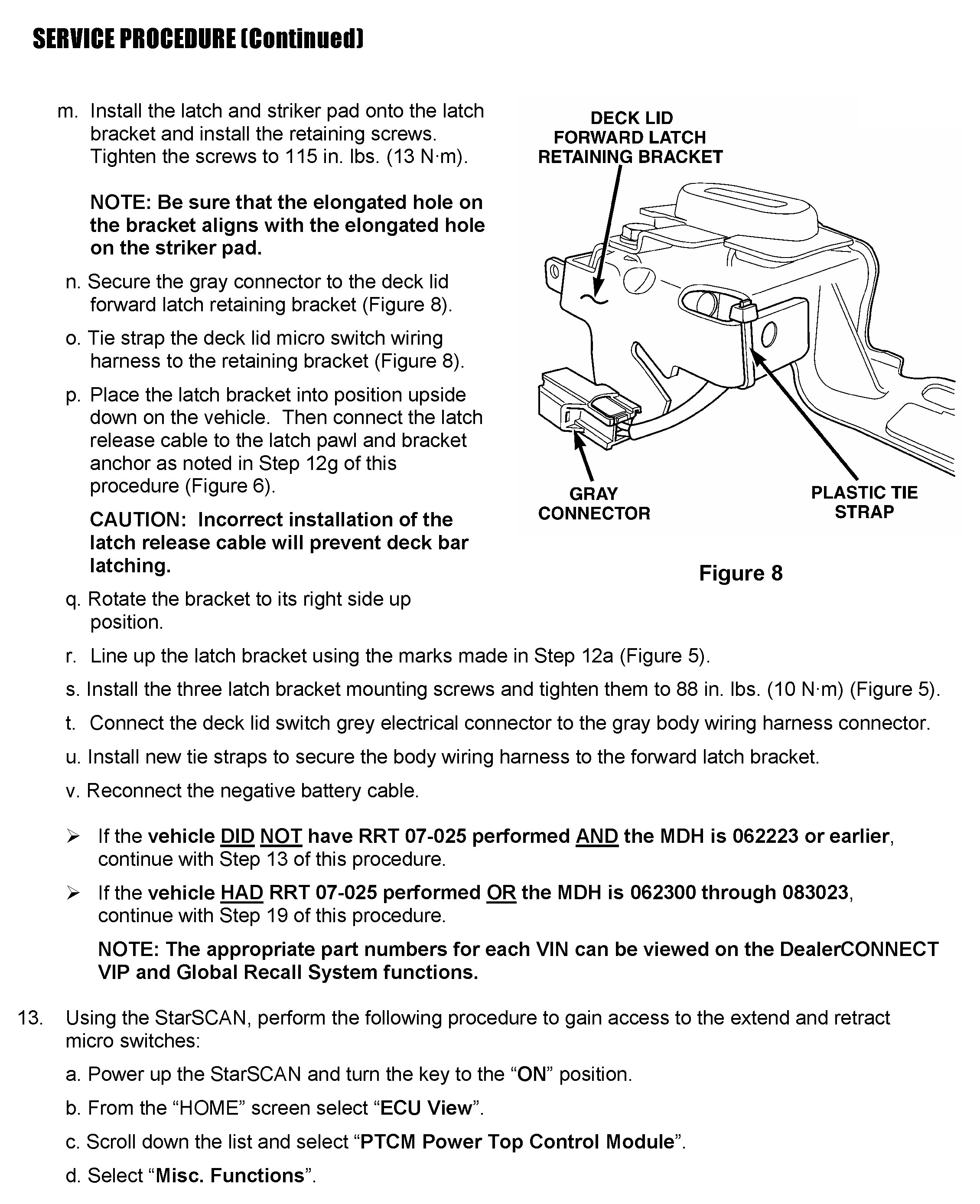 > If the vehicle HAD RRT 07-025 performed, OR the MDH is 062300 through 083023, only the deck lid forward latch micro switch must be replaced, the PTCM must be reprogrammed and a luggage compartment warning tag must be installed.