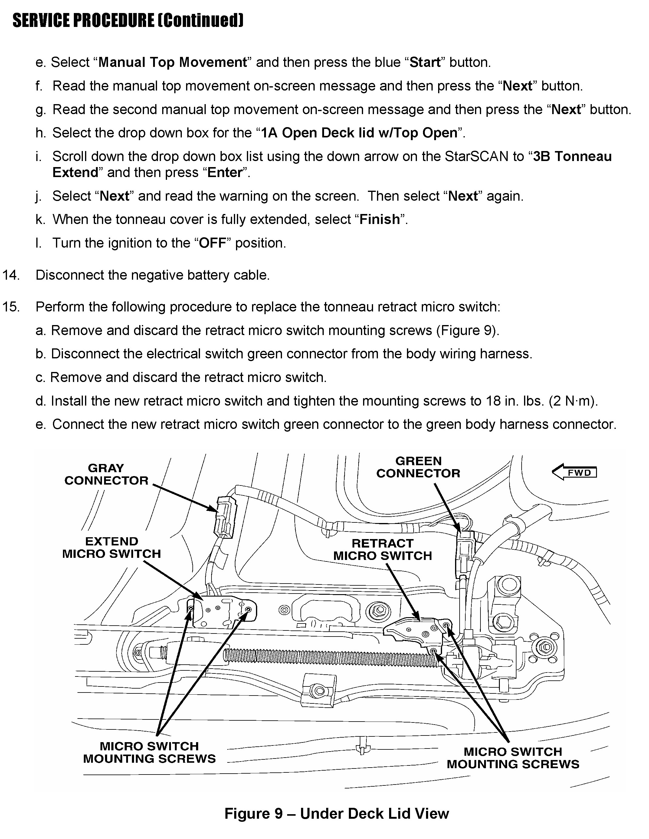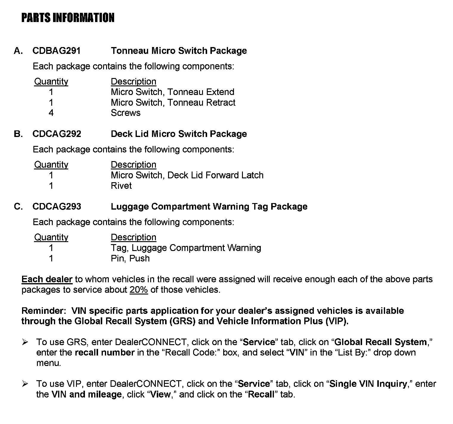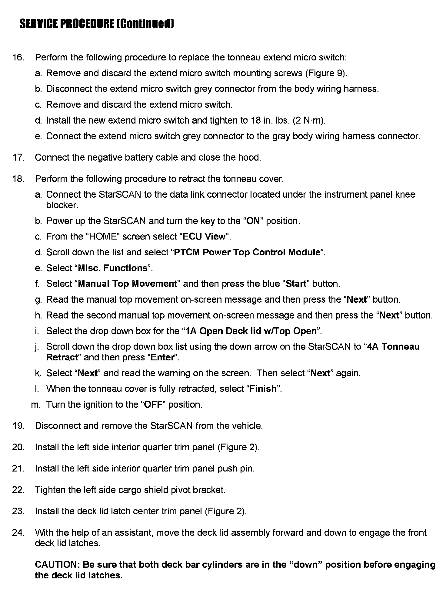 > If the vehicle DID NOT have RRT 07-025 performed AND the MDH is 062223 or earlier, the tonneau extend, retract and deck lid forward latch micro switches must be replaced, the PTCM must be reprogrammed and a luggage compartment warning tag must be installed.