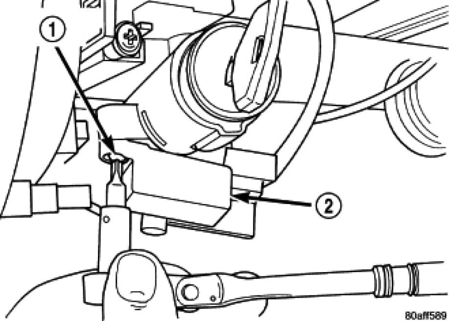 1. Position the interlock housing at steering column. Install the interlock mechanism to steering column attaching screws (1). Tighten screws to 3 Nm (21 in. lbs.).