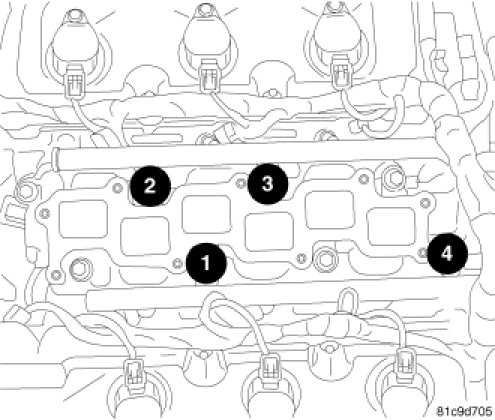 4. Insert fuel injector nozzles into openings in the cylinder heads. Seat the injectors in place. Install the fuel rail bolts and tighten bolts in a mandatory torque sequence to 28 Nm (20.5 ft. lbs.).