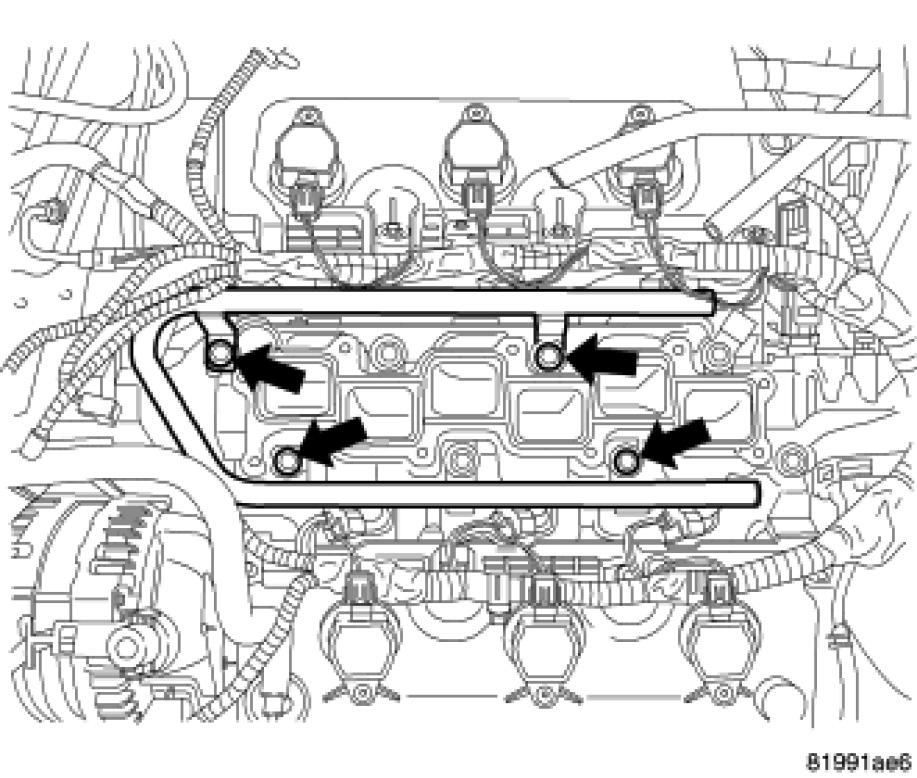 NOTE: Gently rock the fuel rail and injectors back and forth to loosen the seals on the fuel injectors from the cylinder heads.