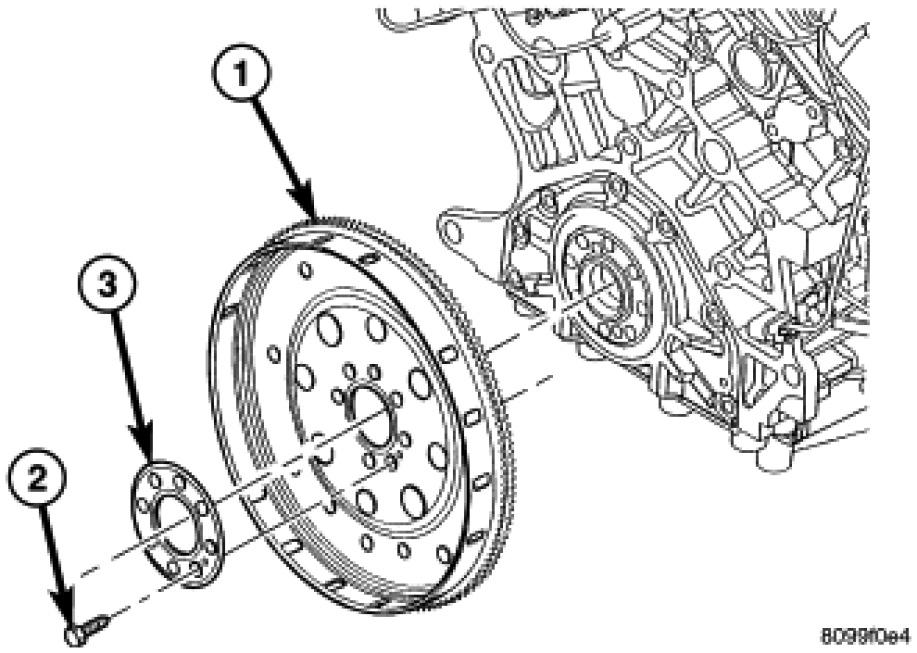 1. Position flex plate (1) with backing plate (3) on the crankshaft.