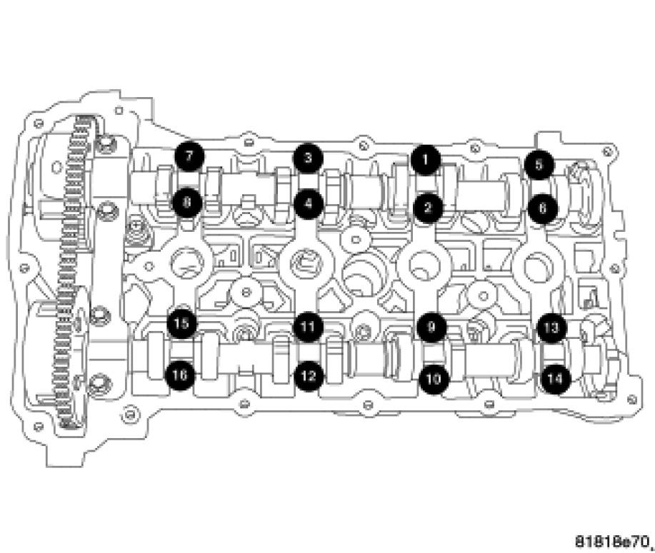 1. Install intake and exhaust camshaft bearing caps and slowly tighten bolts to 9.5 Nm (85 in. lbs.) in the sequence shown.