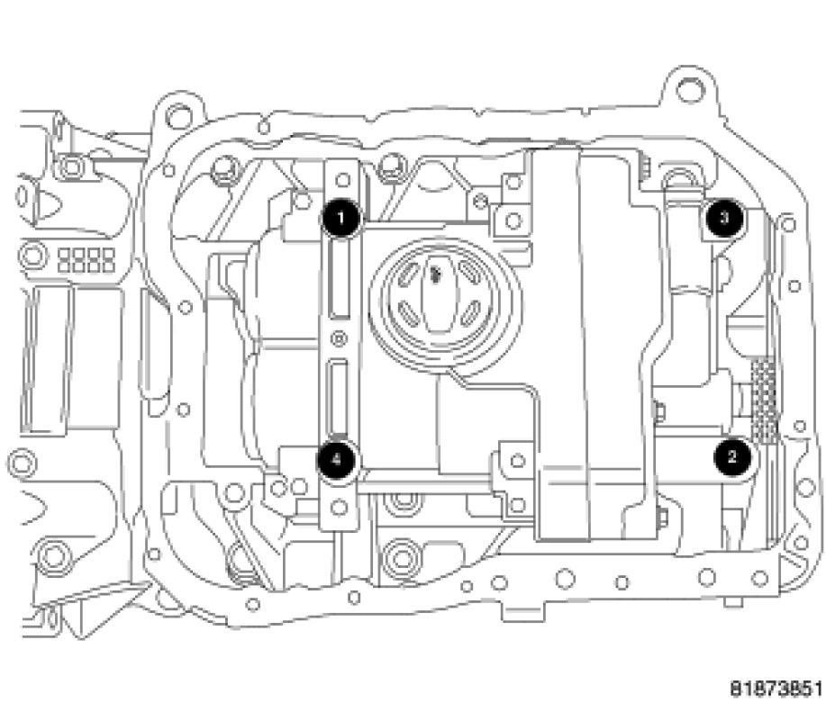 2. Install the front intake and exhaust bearing cap and tighten bolts to 25 Nm (18 ft. lbs.) in the sequence shown.