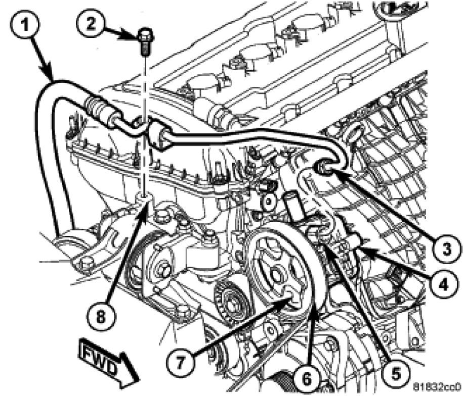 3. Unthread the tube nut (3) and disconnect the power steering pressure hose (1) at the power steering pump pressure fitting (5).