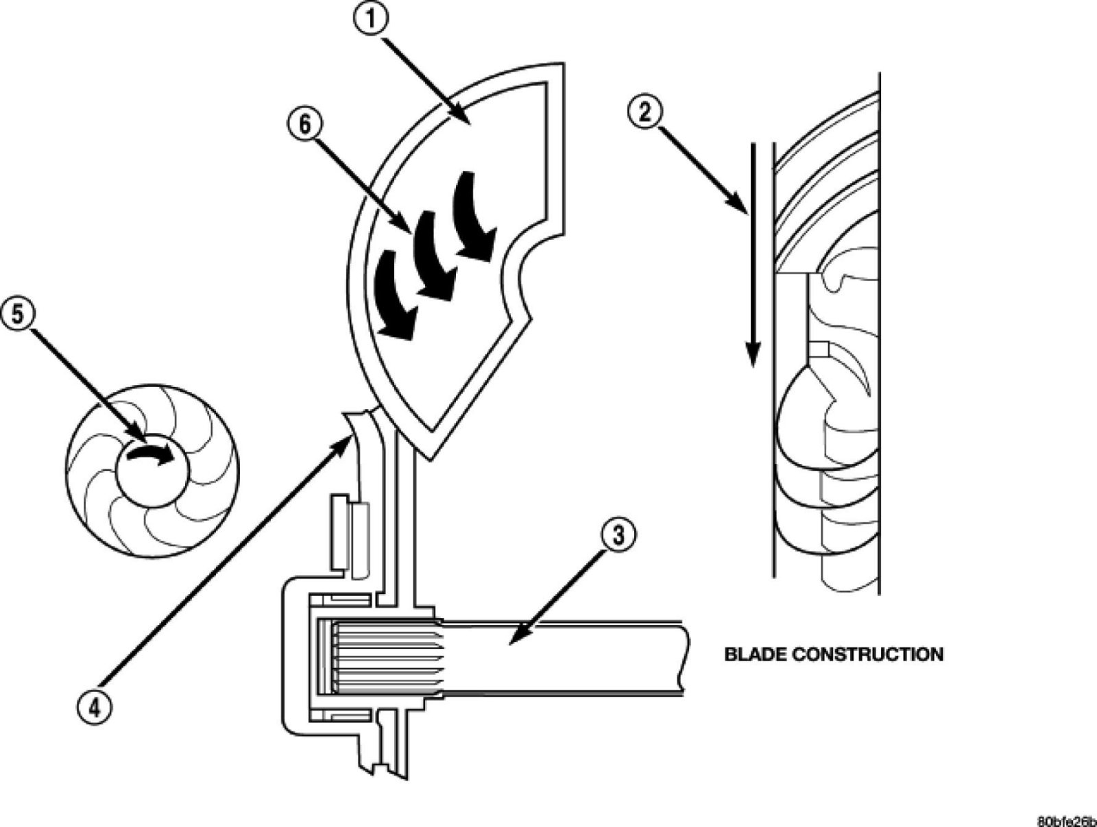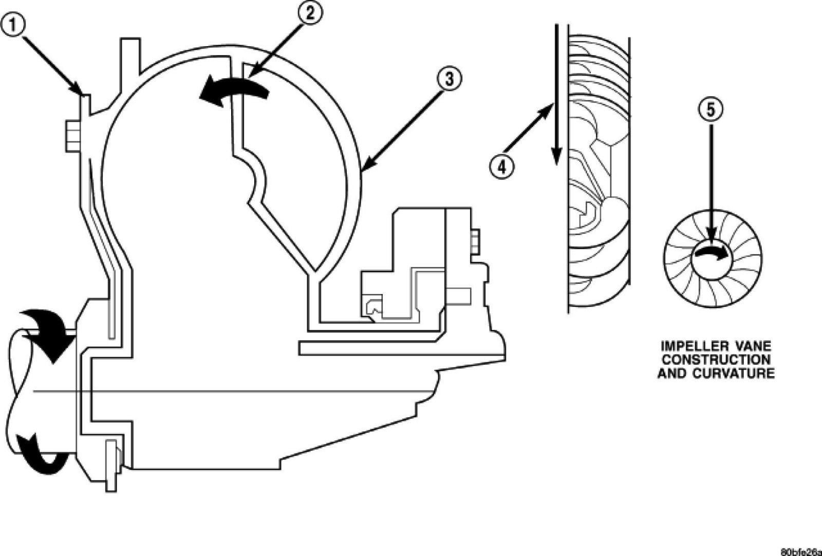 The impeller (3) is an integral part of the converter housing. The impeller consists of curved blades placed radially along the inside of the housing on the transmission side of the converter. As the converter housing is rotated by the engine (4,5), so is the impeller, because they are one and the same and are the driving member of the system.
