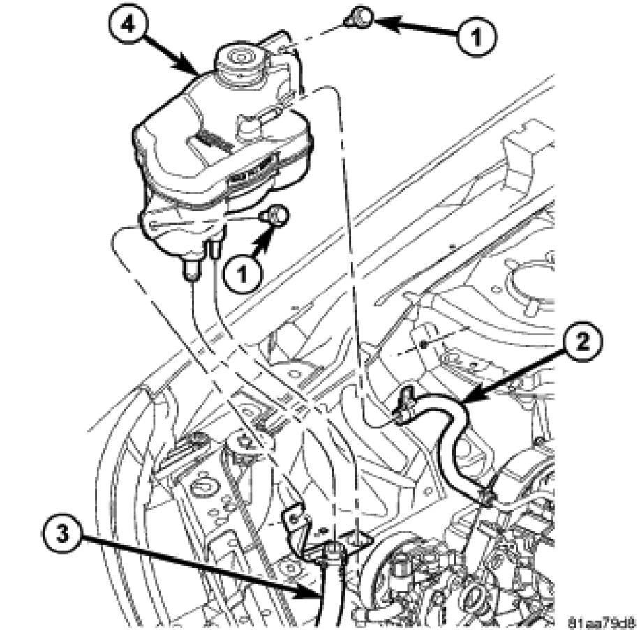 32. Disconnect the coolant reservoir overflow hose (2) from the coolant bottle (4) and position aside.