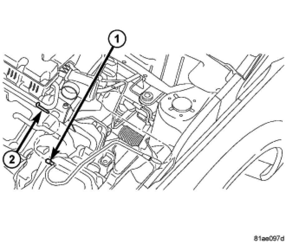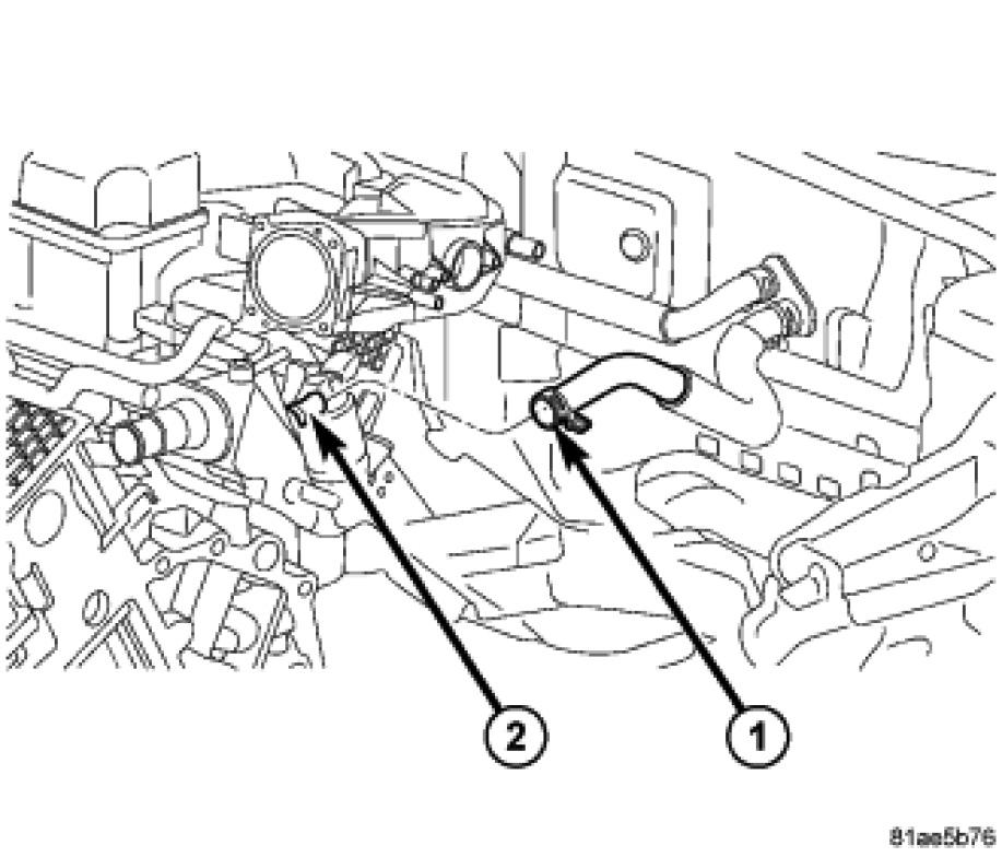 31. Disconnect the heater core supply hose (1) from the intake manifold outlet (2).