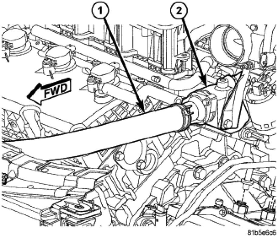 6. Disconnect fuel line (1) from the fuel rail inlet (2) and position aside.