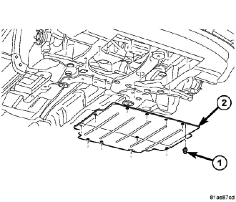 10. Remove the 12 belly pan fasteners (1) and remove the belly pan (2).