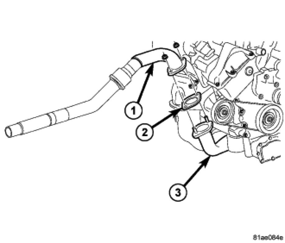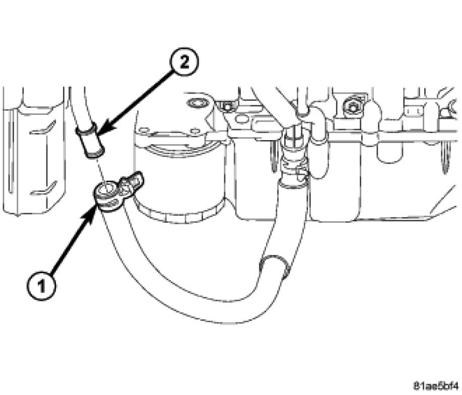 22. Disconnect the Lower Coolant Hose (1) from the return tube (2).