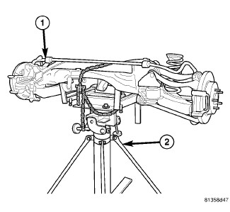 1. Install rear crossmember (1) on jack (2) head in same position in which it was removed and secure in place.