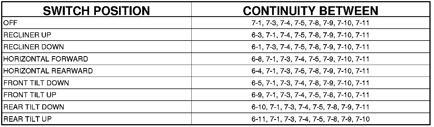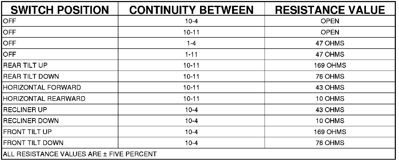 3. Use an ohmmeter to test the continuity of the power seat switch. Refer to PASSENGER POWER SEAT SWITCH CONTINUITY table. If not OK, replace the inoperative power seat switch. If switch tests OK Component Tests and General Diagnostics.