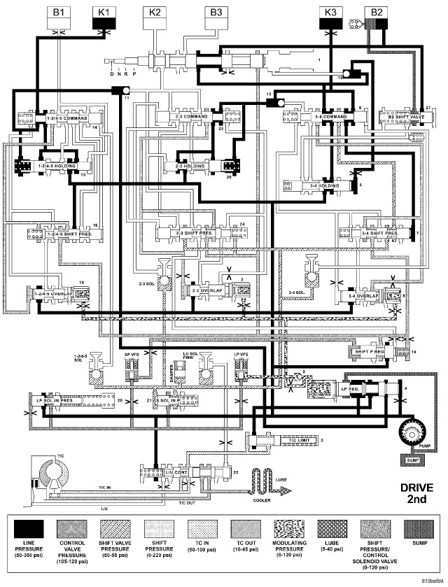 HYDRAULIC FLOW IN DRIVE - FIRST TO SECOND GEAR TRANSITION