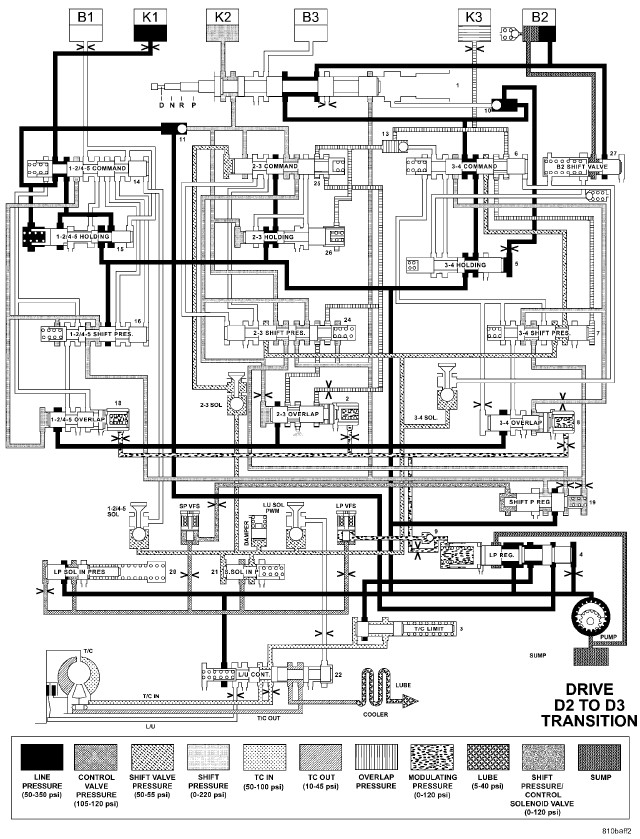 HYDRAULIC FLOW IN DRIVE - SECOND TO FIRST GEAR TRANSITION
