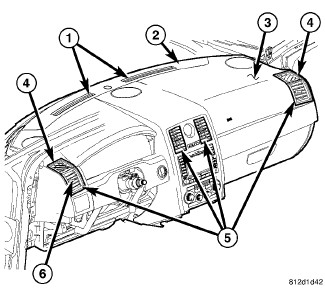 There are four instrument panel air outlets (5). One air outlet is located near each outboard end of the instrument panel facing the rear of the vehicle and two air outlets are located at the top of the instrument panel center bezel. Each of the instrument panel air outlets contain a non-serviceable grille with movable vanes (6) that are used to direct or shut off the flow of the conditioned air leaving the instrument panel outlets. Only the outboard instrument panel air outlets can be serviced separately Instrument Panel Bezel - Removal.