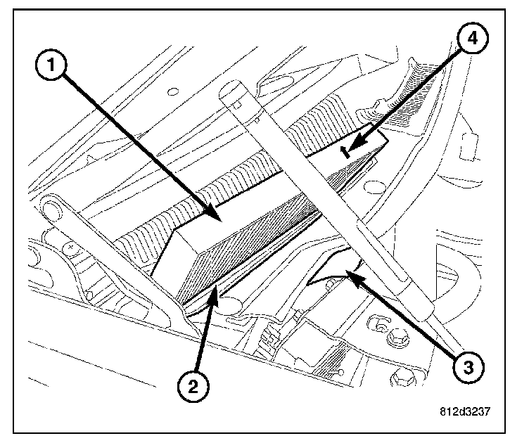 1. Install the particulate air filter (1) into the particulate air filter housing (2) located inside of the dash panel plenum (3). Insert the particulate air filter down directly into the filter housing with the arrow (4) on the filter pointing to the rear of the vehicle. The particulate air filter is held in place by friction between the filter element and the filter housing, so no fasteners are required.