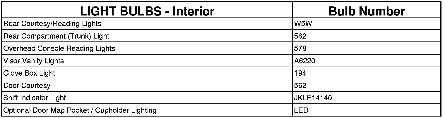 REPLACEMENT LIGHT BULBS - INTERIOR