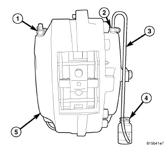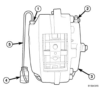 8. Attach a clear hose (5) to the outboard bleeder screw (1) at that same wheels brake caliper and feed the other end of hose into a clear jar (4) containing enough fresh brake fluid to submerge the end of the hose.