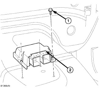 1. Carefully position the Occupant Restraint Controller (ORC) (2) to the ORC bracket that is welded onto the top of the floor panel transmission tunnel. When the ORC is correctly positioned, the arrow on the ORC label will be pointed forward in the vehicle and the locating pins on the bottom of the ORC will be engaged into the locating holes in the ORC bracket.