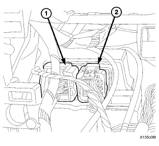 4. Reconnect the two wire harness connectors (1 and 2) to the ORC connector receptacles located on the rearward facing side of the module. Be certain that the latches on both connectors are each fully engaged.