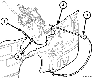 1. Route the shifter cable through the dash panel (4), and install the shifter cable grommet (3) into the hole into the dash panel (4).
