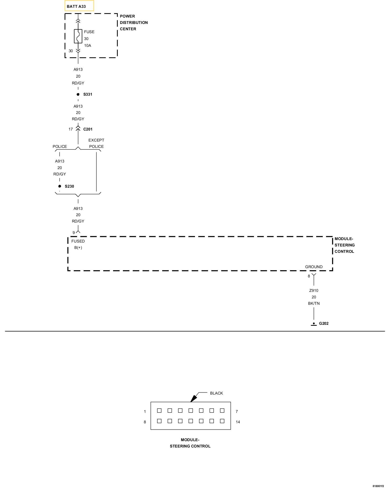 4. Using a 12-volt test light connected to ground, check the (A913) Fused B(+) circuit in the Steering Control Module harness connector.