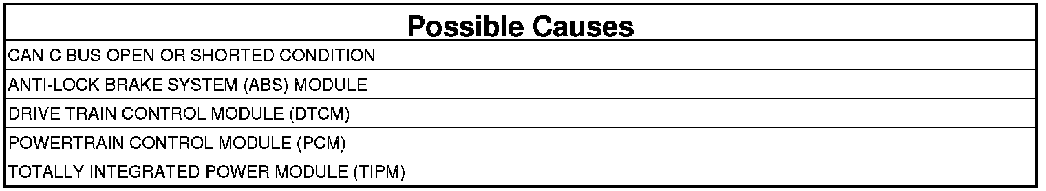 The Drive Train Control Module (DTCM) loses communication over the CAN C Bus circuit. The circuit is continuously monitored. One trip fault.