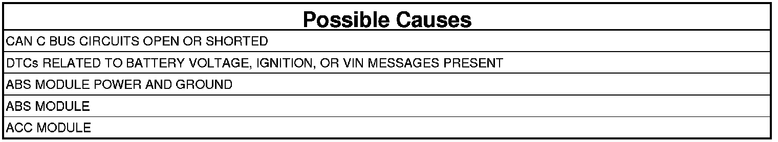 The ACC Module doesn't receive a Bus Message from the Anti-Lock Brakes (ABS) Module within 60 milliseconds. The ACC module will disable the ACC system and the ACC UNAVAILABLE message will display in the Cabin Compartment Node (CCN). Once the Diagnostic Trouble Code (DTC) goes to stored, the ACC system will return to normal operation. The DTC will be cleared after the ACC Module sees 100 consecutive key cycles of the STORED DTC.