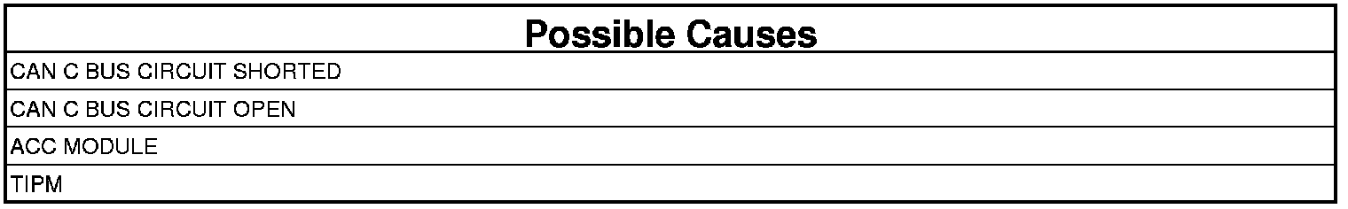 The ACC Module receives an implausible (default/error value or toggle error or parity error are present) message from the Totally Integrated Power Module (TIPM) for 600 millisecond. The ACC module will disable the ACC system and the ACC UNAVAILABLE message will display in the Cabin Compartment Node (CCN). Once the Diagnostic Trouble Code (DTC) goes to stored, the ACC system will return to normal operation. The DTC will be cleared after the ACC Module sees 100 consecutive key cycles of the STORED DTC.
