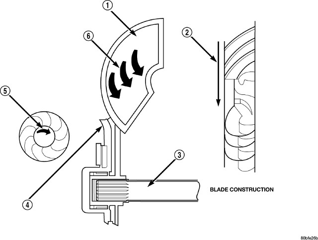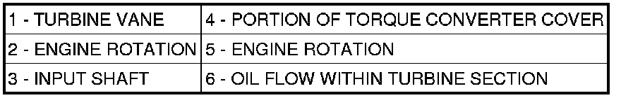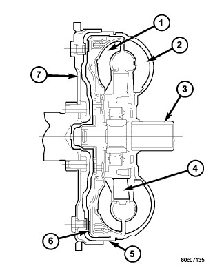 The torque converter is a hydraulic device that couples the engine crankshaft to the transmission. The torque converter consists of an outer shell with an internal turbine (1), a stator (4), an overrunning clutch, an impeller (2) and an electronically applied converter clutch (6). The converter clutch provides reduced engine speed and greater fuel economy when engaged. Clutch engagement also provides reduced transmission fluid temperatures. The torque converter hub drives the transmission oil (fluid) pump.