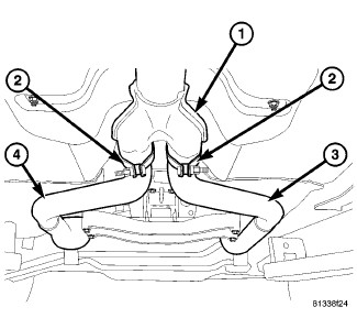 2. Install exhaust pipe assembly into catalytic converters (3 and 4).