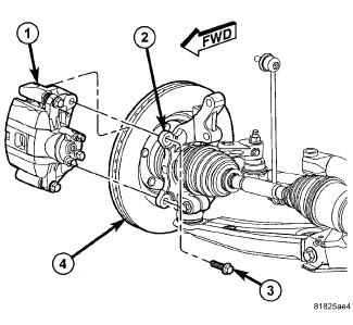 4. Remove the disc brake caliper and adapter bracket (1) from the knuckle (2) and rotor (4) as an assembly. Hang the assembly out of the way using wire or a bungee cord. Use care not to overextend the brake hose when doing this.