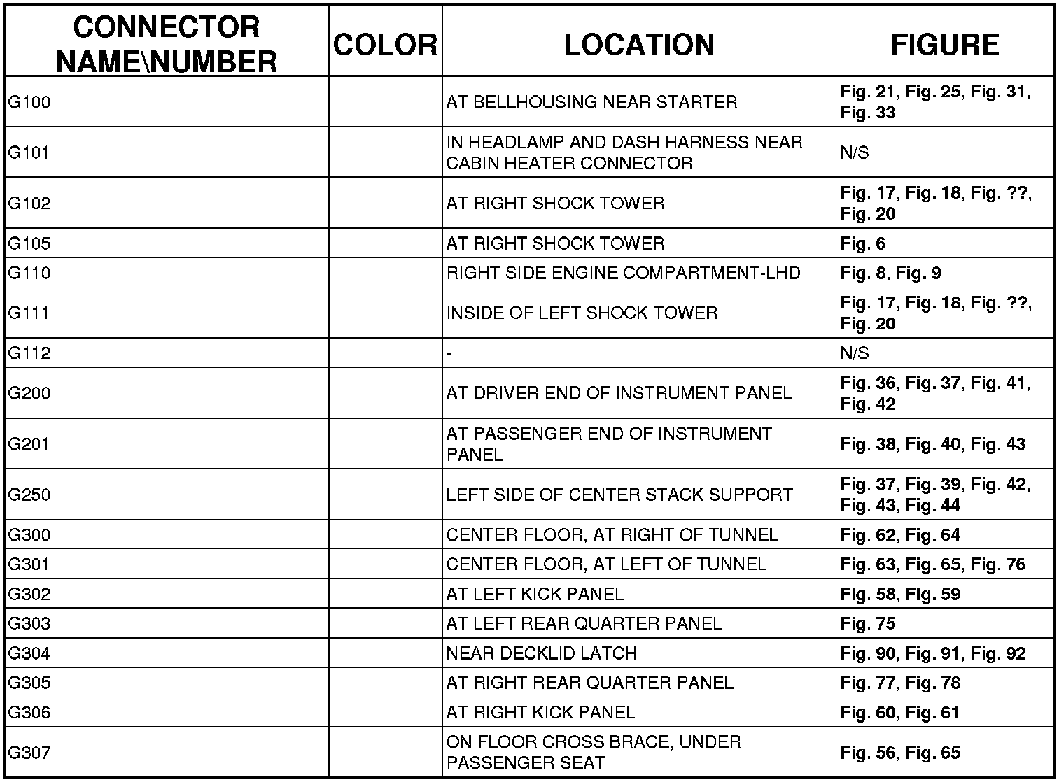The abbreviation T/O (Take Out) is used in the location column to indicate a point in which the wiring harness branches out to a component.