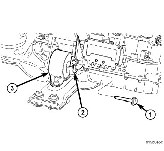 4. Remove the engine roll mount (2) through bolt (1) and remove the fore/aft cross-member.