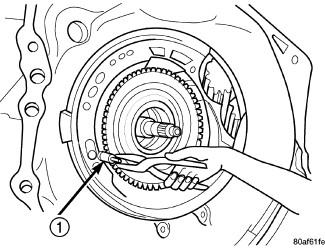 61. Measure the input shaft end play with the transaxle in the vertical position. Input shaft end play must be within 0.005 to 0.025 inch. For example, if end play reading is 0.055 inch, select No. 4 Thrust Plate which is 0.071 to 0.074 thick. This should provide an input shaft end play reading of 0.020 inch which is within specifications.