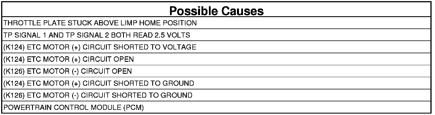 NOTE: The PCM tests the ETC Motor by opening and closing the Throttle Plate before starting the engine. If during this test the Throttle plate does not return to the closed position this DTC sets.